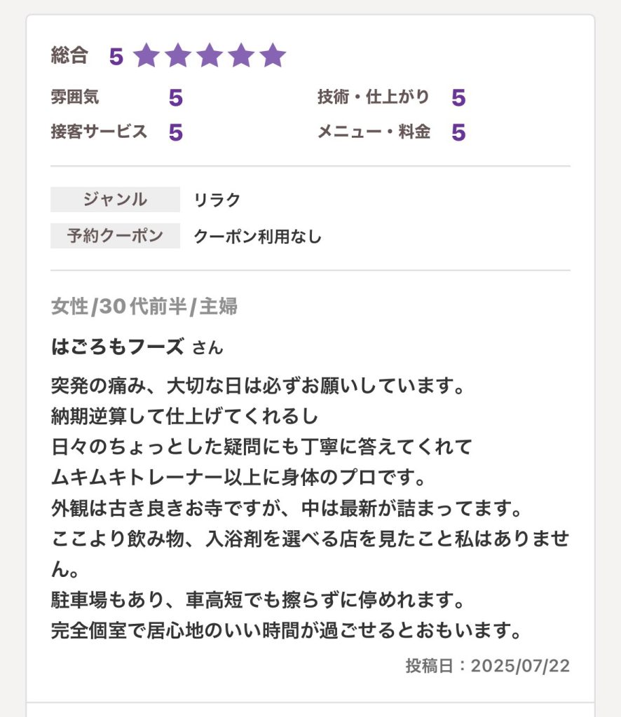 2025/07/22 [投稿日] 2025/7/22 総合5★★★★★ 雰囲気5 接客サービス5 技術・仕上がり5 メニュー・料金5 突発の痛み、大切な日は必ずお願いしています。納期逆算して仕上げてくれるし日々のちょっとした疑問にも丁寧に答えてくれてムキムキトレーナー以上に身体のプロです。外観は古き良きお寺ですが、中は最新が詰まってます。ここより飲み物、入浴剤を選べる店を見たこと私はありません。駐車場もあり、車高短でも擦らずに停めれます。完全個室で居心地のいい時間が過ごせるとおもいます。