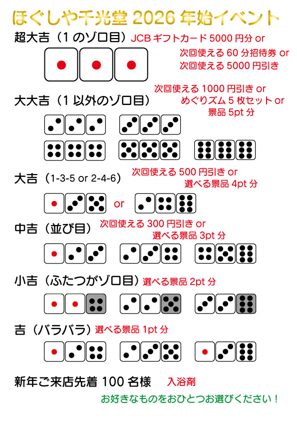 サイコロのでために応じて豪華賞品ゲット!本年の超大吉は「5000円分のJCBギフト券」「60分招待券」「回数券5000円引き券」などが当たります。